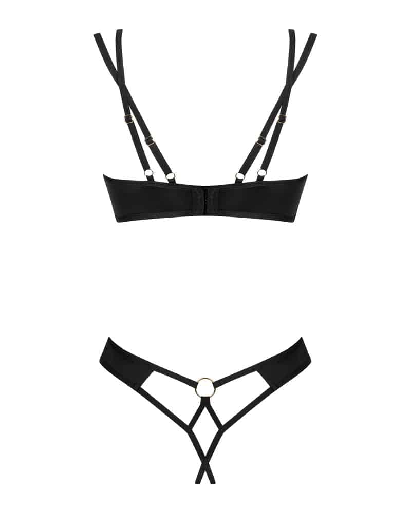 BH und String ouvert im schwarzen Set Nesari von Obsessive. Weiches elastisches Netz im stylischen Mix mit blickdichtem Stretchmaterial. BH mit Schmuckelement zwischen den Cups und verstellbarem Hakenverschluss im Rücken. Die raffiniert gekreuzten Doppelträger sind ebenfalls passend verstellbar. Der Netz-String verführt mit Ring und Riemchen-Optik über dem Po und verführerisch offenem Schritt.