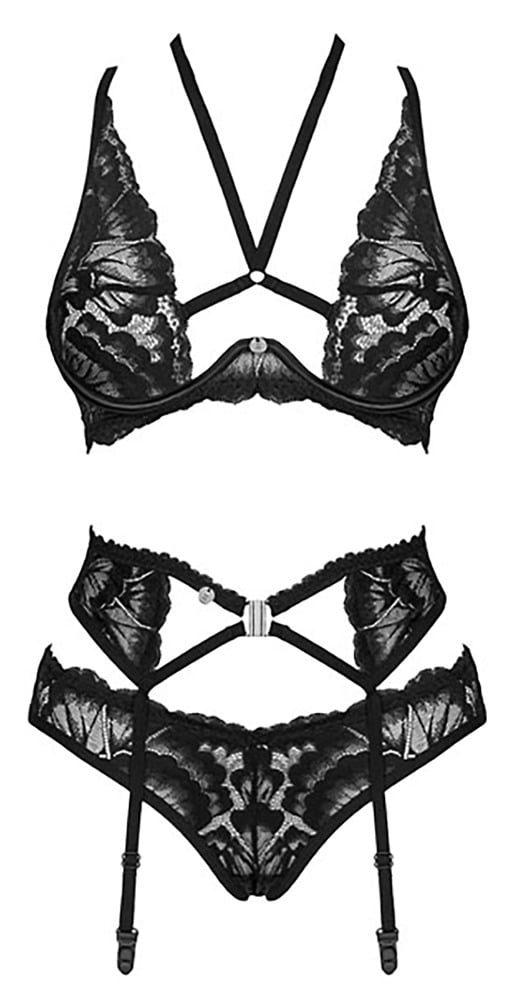 Bügel-BH, Strapsgurt und Slip im Set Alessya von Obsessive aus feiner Effektspitze. Weich und elastisch für höchsten Tragekomfort. Bügel-BH mit dekorativen, elastischen Riemchen im Dekolleté, die zum Clipverschluss im Nacken führen. Im Rücken mit verstellbarem Hakenverschluss. Die Träger sind passend verstellbar, genauso wie die Strumpfhalter des Strapsgurtes. Der Gurt verführt ebenfalls mit Stretchriemchen und einem dekorativen Frontverschluss. Die aufregende Schnittführung des Spitzenslips betont besonders raffiniert den Po.