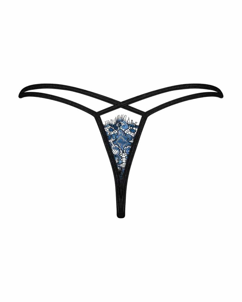 Raffiniert geschnittener String Yassmyne von Obsessive aus blauer Wimpernspitze mit schwarzen weichen Stretchriemchen. Vorne am Bund mit kleinem Schmuckelement.