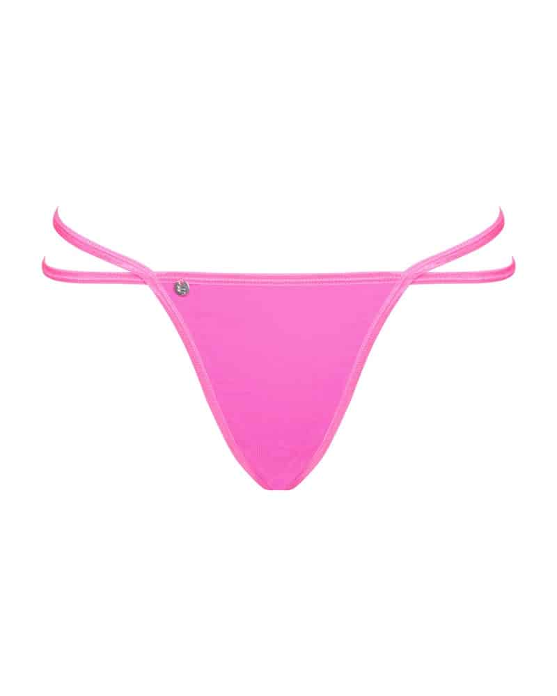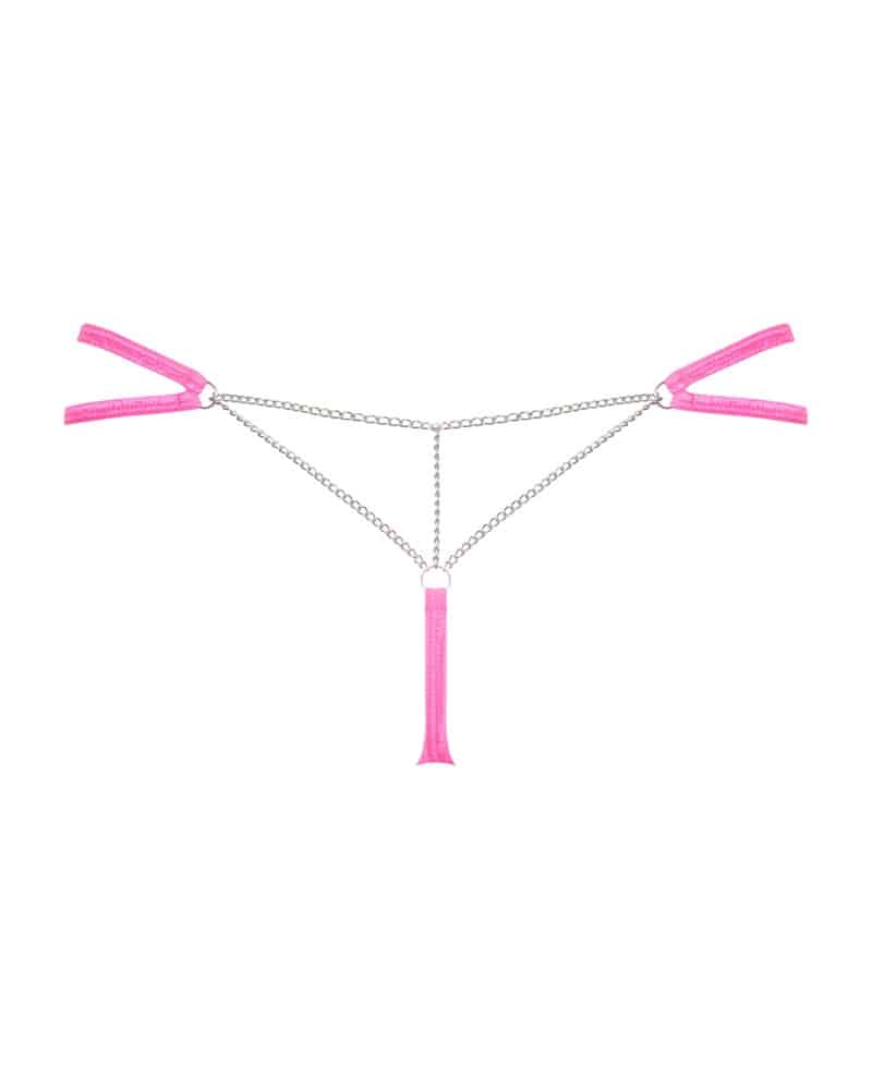 Pinkfarbener String Chainty von Obsessive mit dekorativem Kettchen-Besatz über dem Po. Aus weichem Stretchmaterial mit doppelten Stretchriemchen als Bund.