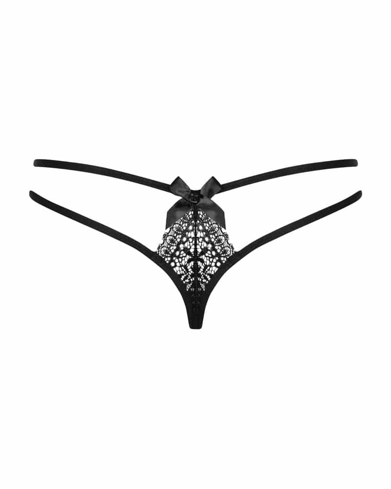 Transparent-schwarzer String Intensa von Obsessive aus softer elastischer Spitze mit schmalen weichen Stretchbändern. Raffinierter Doppelbänder-Bund mit Schleifchenverzierung jeweils vorne seitlich und über dem Po.