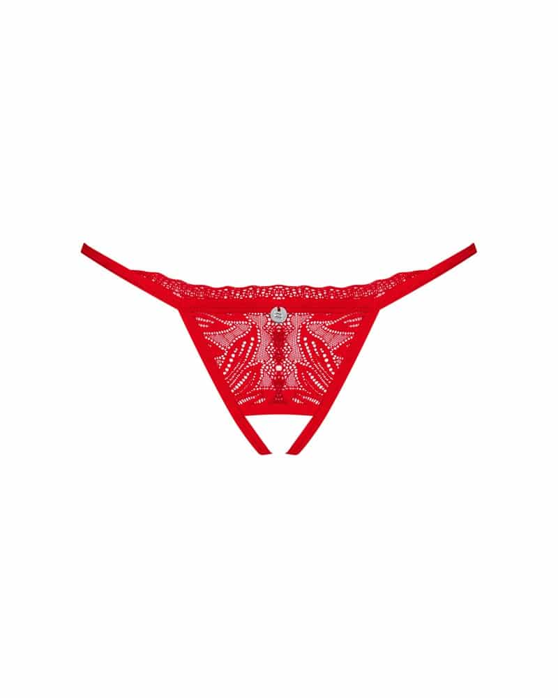 Der zarte String Chilisa von Obsessive besteht aus feiner Blütenspitze und ist einladend ouvert im Schritt. Über dem Po befindet sich ein raffiniertes Cut-out mit einem filigranen Herzchen-Anhänger.