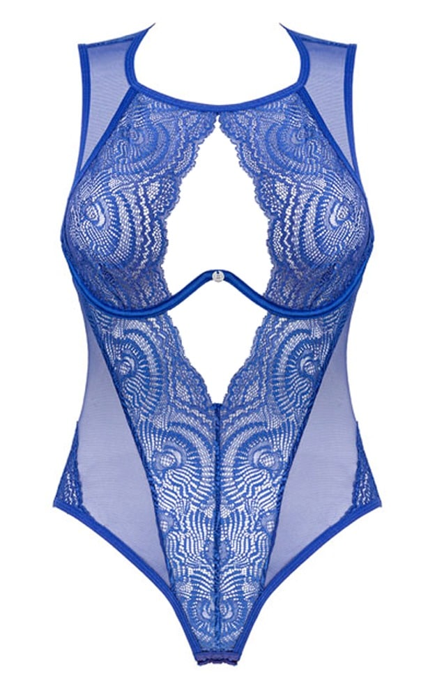 Charmanter Body Giselia von Obsessive aus royalblauer Spitze im Mix mit zartem Powernet. Weich und elastisch für höchsten Tragekomfort. Die raffinierte Schnittführung mit tiefem Dekolleté und nahezu freiem Rücken schmeichelt der Silhouette, die hohen Beinausschnitte strecken optisch die Beine. Eingearbeitete Cupbügel und verstellbare Träger sorgen für perfekte Passform. Im Nacken und Rücken mit Clipverschluss, im Schritt mit Hakenverschluss.