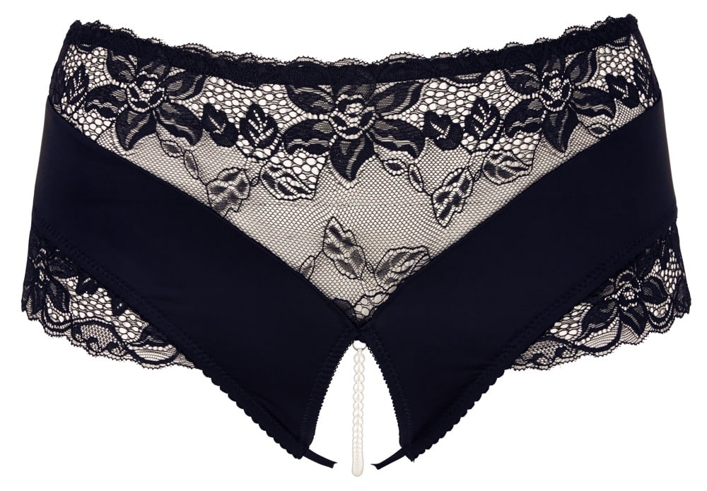 Taillenhoher Slip mit zartem Spitzeneinsatz und elastischer Perlenkette im offenen Schritt. Atemberaubend sexy und gleichzeitig stimulierend bei jeder Bewegung.