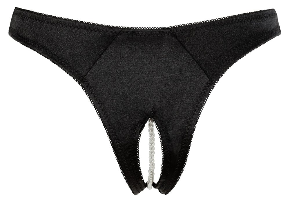 Seidiger Slip ouvert mit stimulierender Perlenkette durch den Schritt. Aus Satin mit aufwendiger Stickerei in der Front.