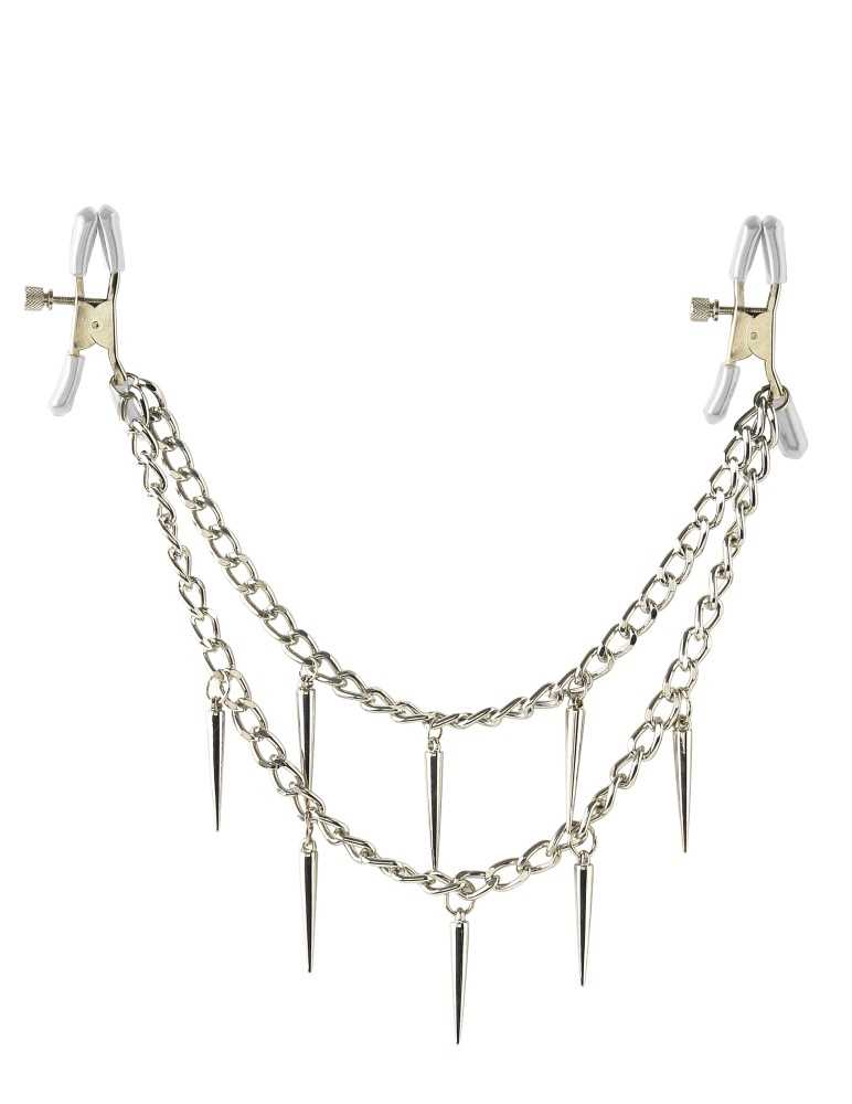 Die Klemmen bestehen aus hochwertigem, langlebigem Metall in glänzendem Silber. Sie sind so geformt, dass sie sicher an den Brustwarzen sitzen, ohne dabei an Stabilität zu verlieren. Das elegante Design wird durch die zwei Ketten ergänzt, die nicht nur einen visuellen Akzent setzen, sondern auch für zusätzliche Stimulation sorgen.