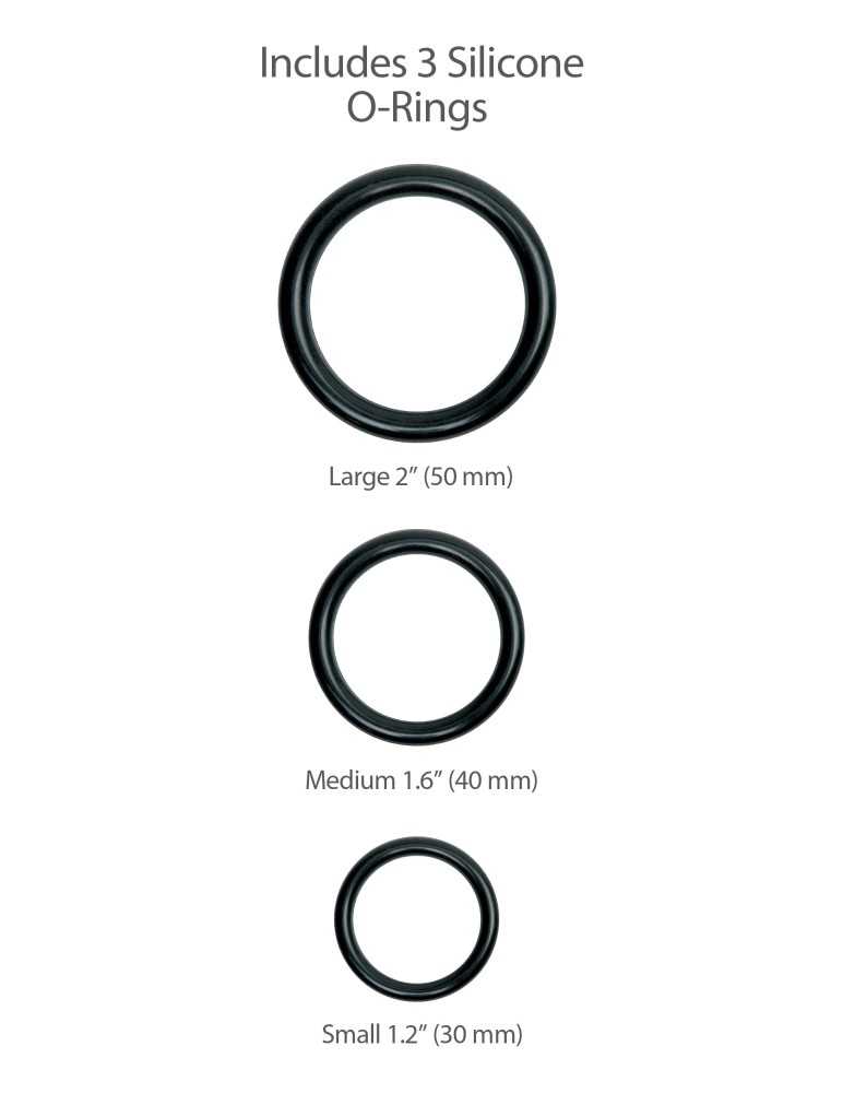 Im Lieferumfang enthalten sind drei Silikonringe in den Größen 3 cm, 4 cm und 5 cm Durchmesser. Diese ermöglichen die Nutzung mit unterschiedlichen Dildos oder Toys, sodass das Harness vielseitig einsetzbar bleibt. Die Ringe sind robust, flexibel und leicht zu reinigen, wodurch sie eine langlebige Ergänzung zum Set darstellen.