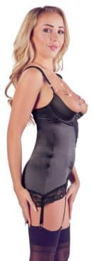 Sinnliches Hebestrapshemd mit verstellbaren, abnehmbaren Strapsen und einer leicht gefütterten Bügel-Hebe mit Hakenverschluss im Rücken. Mit raffinierten Spitzen-Details und aufwendigen Strass-Elementen im Dekolleté. Diese verlaufen an drei dünnen Kettchen an beiden Seiten über die Brüste und im Neckholder-Stil um den Hals. Zusätzliche Spitzenelemente verlaufen als Einsatz über die Front, an den Trägern und am Saum des Strapshemdes. Der passende String ist im Schritt verführerisch offen und versehen mit einem kleinen Kettchen, welches bei jeder Bewegung sinnlich stimuliert. Dieses kann mittels kleiner Karabiner entfernt werden, genau wie die Kettenelemente am Strapshemd.