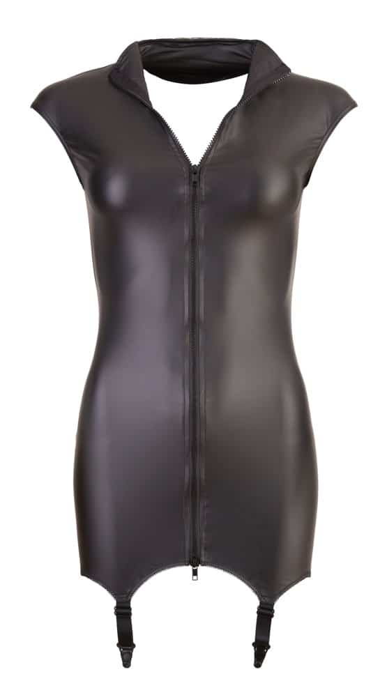 Das hochgeschlossene und ärmellose kurze Kleid von Cottelli PARTY aus mattglänzendem Stoff überzeugt mit seinem Zwei-Wege-Reißverschluss vorne und den vier angenähten Strapshaltern. Schwarz.