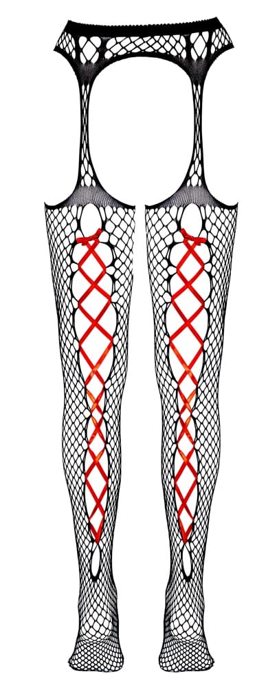 Straps-Strumpfhose in Strapsgurt-Optik. Aus grobem Netzmaterial mit roter Zierschnürung hinten. Aufregend extravagant und so bequem wie eine Strumpfhose. Ein absolutes Must-have für verführerische Auftritte!