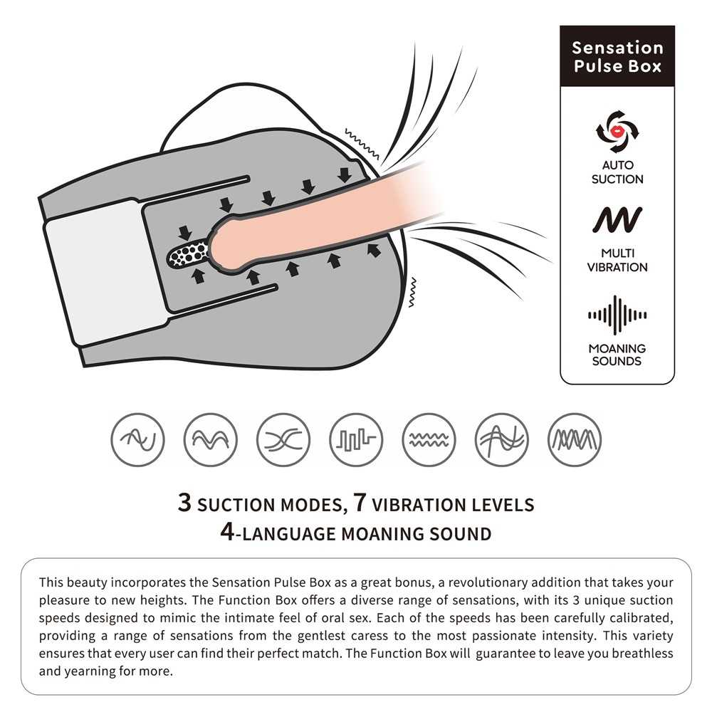 Besonders innovativ sind die realistischen Stöhngeräusche, die während der Nutzung erklingen. Diese verstärken das Gefühl einer authentischen Begegnung und sorgen für intensive Sinnlichkeit. Der Nutzer kann zwischen Englisch, Japanisch, Koreanisch und Chinesisch wählen. Damit lässt sich das Erlebnis individuell anpassen und steigern – ein Feature, das den Masturbator mit Vagina und Anus zu einem immersiven Toy macht.