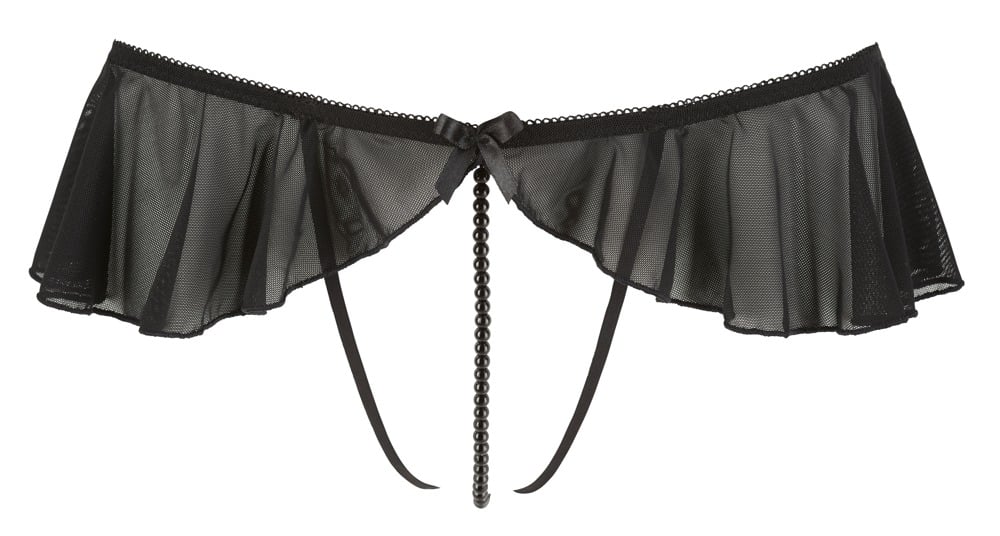 Sinnlicher String ouvert mit figurumschmeichelnden Volants und schwarzer Perlenkette durch den Schritt. Die offene Scham wird lasziv von 2 elastischen Bändern umrahmt.