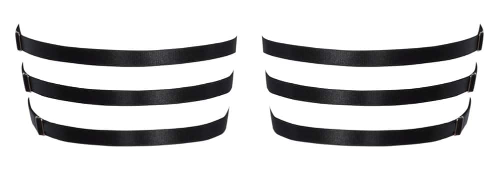 Schwarzes Dreifach-Strumpfband von Cottelli ACCESSOIRES mit abnehmbaren Strapsen. Aus weichen Stretchriemen mit edlem Glanz. Mit silberfarbenen Ringen und Strassstein-Verzierungen. Rundum verstellbar für perfekten Halt. Auch die abnehmbaren Strumpfhalter sind passend verstellbar.