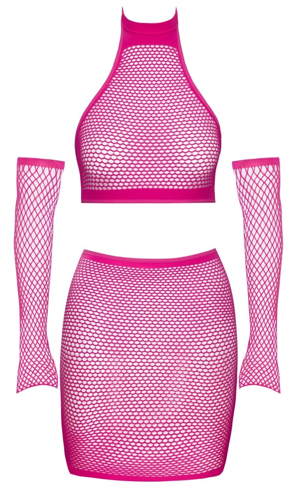 Pinkfarbenes Netz-Set von Cottelli FANTASY mit kurzem Top, Minirock und Armstulpen. Die weichen elastischen Netzmaschen schmiegen sich hautnah an. Alles nahtlos gefertigt und mit weichen Bündchen für hohen Tragekomfort. Rücken- und bauchfreies Top mit hochelastischem Stehkragen-Neckholder.