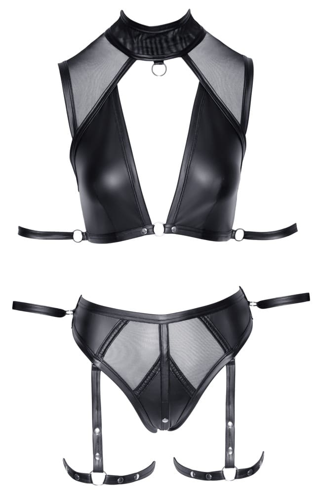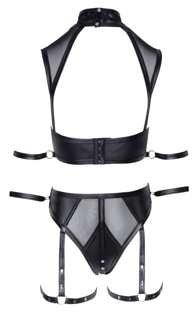 Top plus Slip von Cottelli BONDAGE im edlen Mattlook mit transparenten Powernet-Einsätzen. Großzügig dekolletiertes Top mit hohem Kragen, der vorne mit einem Ring verziert ist und hinten mit 2 Druckknöpfen geschlossen wird. Nahezu rückenfrei mit breitem Hakenverschluss-Steg. Seitlich jeweils ein Ring mit Fesselriemen für die Arme. Der Slip ist taillenhoch geschnitten und hat im Schritt einen erotisch-praktischen Druckknopfverschluss. Am Taillenbund jeweils seitlich ein Ring mit Fesselriemen für die Hände. Die Schenkel-Harnesses können komplett abgenommen werden. Die Fesselriemen für Arme und Hände sind jeweils mit verstellbarem Klettverschluss ausgestattet und ebenfalls abnehmbar.